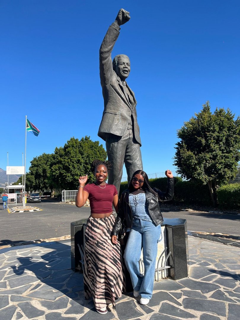 Bei einer Whale Watching Tour vor Hermanus haben einige das erste Mal Wale gesehen und ein weiteres Highlight war natürlich der Tafelberg, sei es, dass man ihn vom Strand aus beim Sonnenuntergang bewunderte, zu Fuß erklomm oder von der Seilbahn aus die Aussicht genoss. Wer sich über Fotos mit „funky socks“ wundert, so sei erklärt, dass in Südafrika am 12.09.2025 der nationale Funky Socks Day gefeiert wurde, um seine Unterstützung für Charities zu bekunden. Aber auch für das leibliche Wohl war rundum gesorgt. Bereits zum Welcoming Event stieß man bei einem hervorragenden Braai, der südafrikanischen Version eines Barbeques, gemeinsam auf zwei erfolgreiche Wochen mit „Springbokkie“ an und bewunderte am Lagerfeuer die Mondfinsternis. An einem Samstag ging es mit der Franschhoek Wine Tasting Tram auf das Weingut Lynx, wo man den Sonnenuntergang über die weiten Weinfelder bei einem „Harvest Tabel“ genießen konnte. Ein besonderes Event war das International Lunch, zu dem die Studierenden aus Südafrika viele Köstlichkeiten ihres Landes zusammentrugen und vor allem empfahlen, Koe’sister zu probieren, ein traditionelles Kap-Malaiisches Gebäck. Insgesamt ist die Kaufkraft des Euros so stark, dass sich die Studierenden abends auf der Longstreet, der Lebensader von Kapstadt, oder an der Victoria & Alfred Waterfront unter die Locals mischen konnten, was dank des großen Aufkommens an Ubern erschwinglich und sicher war.
